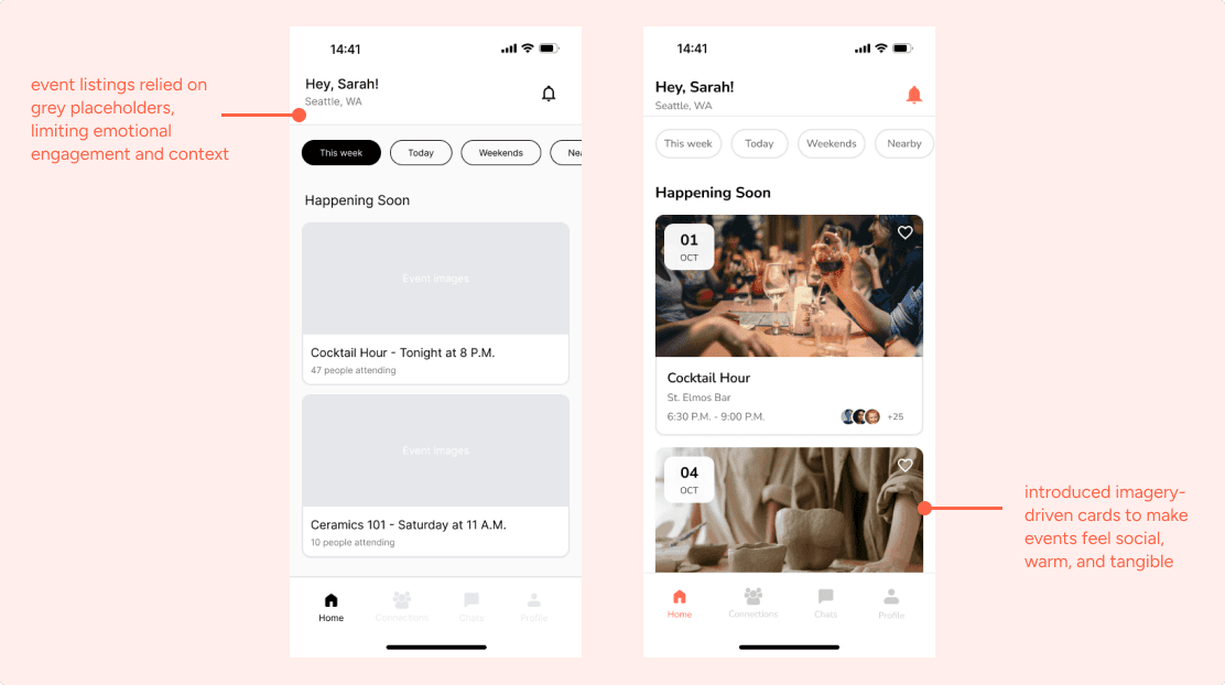 Bumble BFF: The swipe-based matching felt transactional and did not facilitate natural community building. Quick connections feel superficial rather than intentional.